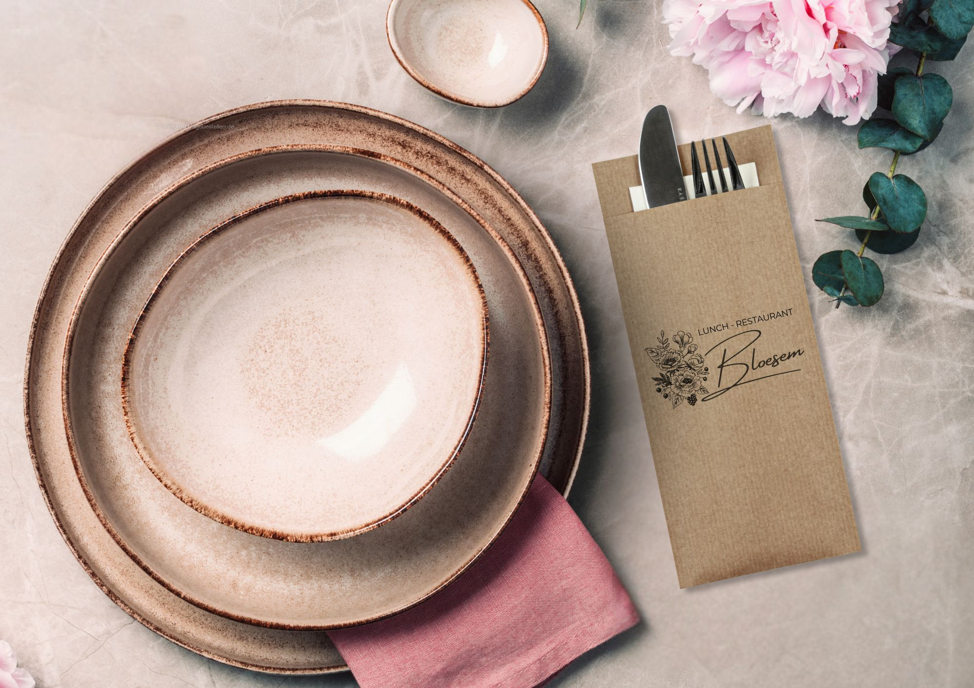 Die Bestecktasche sind bereits mit einer Papierserviette von 24 x 40 mm (Auswahl aus verschiedenen Farben) ausgestattet. Sie müssen lediglich das Besteck einsetzen Die Bestecktasche sind in stabilem weißem, braunem oder schwarzem Papier erhältlich. Bei den weißen Bestecktaschen können Sie mit oder ohne Besteckschnitt wählen. Sie können die Bestecktasche mit Ihrem Logo, Firmennamen, Ihrer Nachricht usw. versehen lassen (nicht vollflächig). Sie können sogar die Bestecktasche personalisieren lassen. Durch die Verwendung bedruckter Bestecktasche werden Ihre Gäste ständig an Ihren Firmennamen erinnert. Dies macht es indirekt zu einem perfekten Werbeträger.