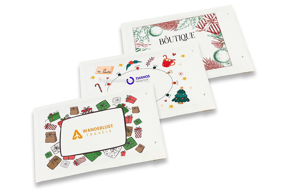 Das stabile Kraftpapier auf der Außenseite und die schützende Luftpolsterfolie auf der Innenseite sorgen dafür, dass Ihre Produkte sicher verpackt sind. Sie können aus verschiedenen auffälligen Weihnachtsmotiven wählen – mit diesen Umschlägen wird Ihre Sendung garantiert Aufmerksamkeit erregen! Auch hier können Sie Ihr eigenes Logo in das Weihnachtsdesign integrieren. Damit verleihen Sie Ihren Umschlägen eine persönliche und professionelle Note und sorgen dafür, dass Ihre Marke in der Weihnachtszeit besonders auffällt.
